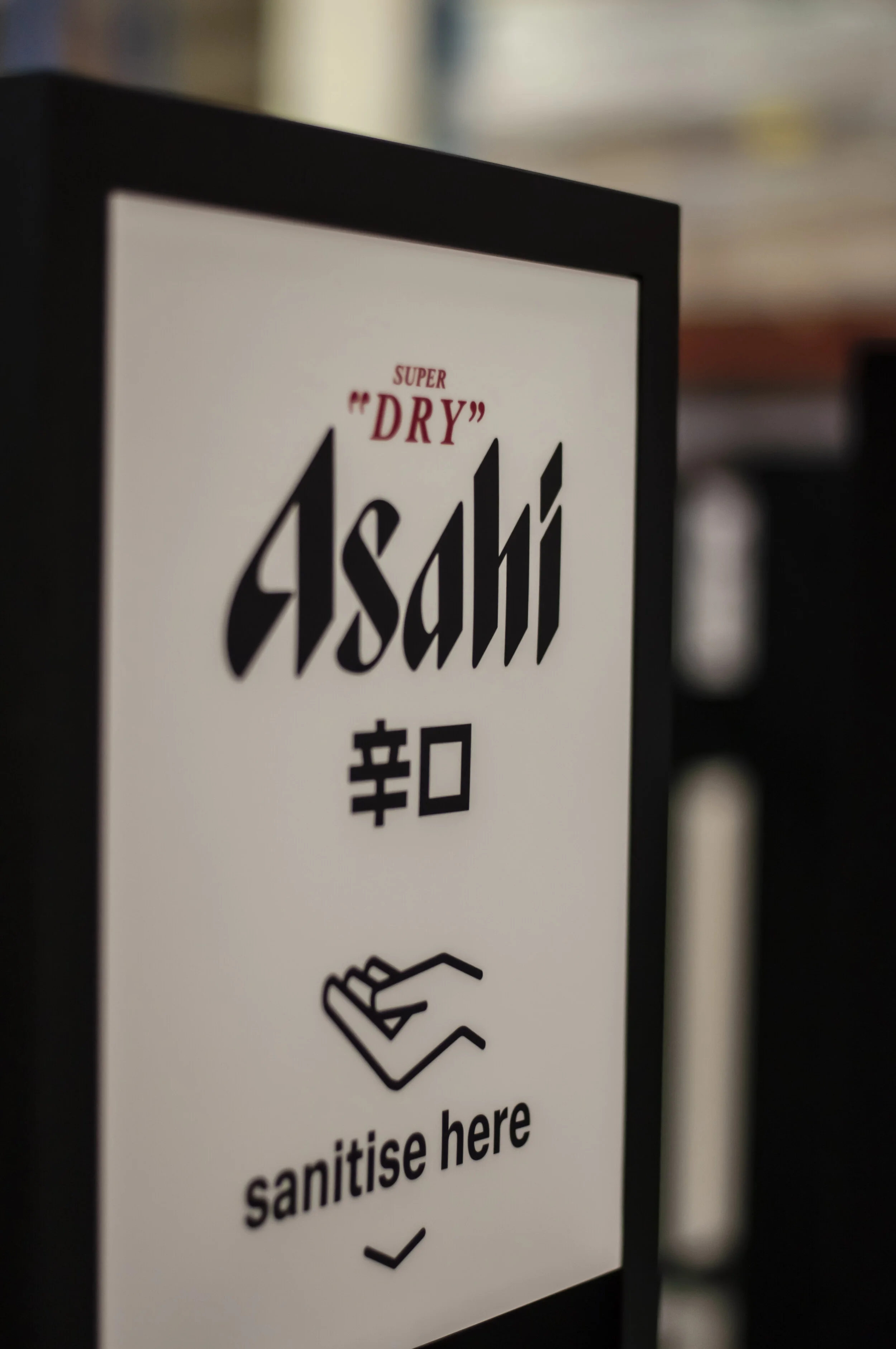 Off the back of their longstanding relationship with DisplayWise, Communicado requested the production of one hundred BARE Hygiene hand sanitiser units, each of them custom finished with Asahi branding. Opting for the popular Vogue Stand Up model, the order was requested to be custom finished with an interchangeable magnetic branding plate: a feature that allowed the client to use the stations across its dynamic group of beverage brands with ease.